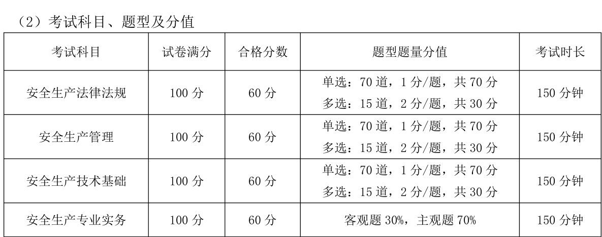 安全工程师考试一共四个科目,安全生产法律法规单,安全生产管理,安全生产技术基础,安全生产专业实务,其中,安全生产法律法规单,安全生产管理,安全生产技术基础为公共科目,满分100分,60分及格,考试题型均为单选:70道,1 分/题,共 70 分;多选:15 道,2 分/题,共 30 分。安全生产专业实务 客观题30分,主观题70分,各科考试时间均为150分钟。