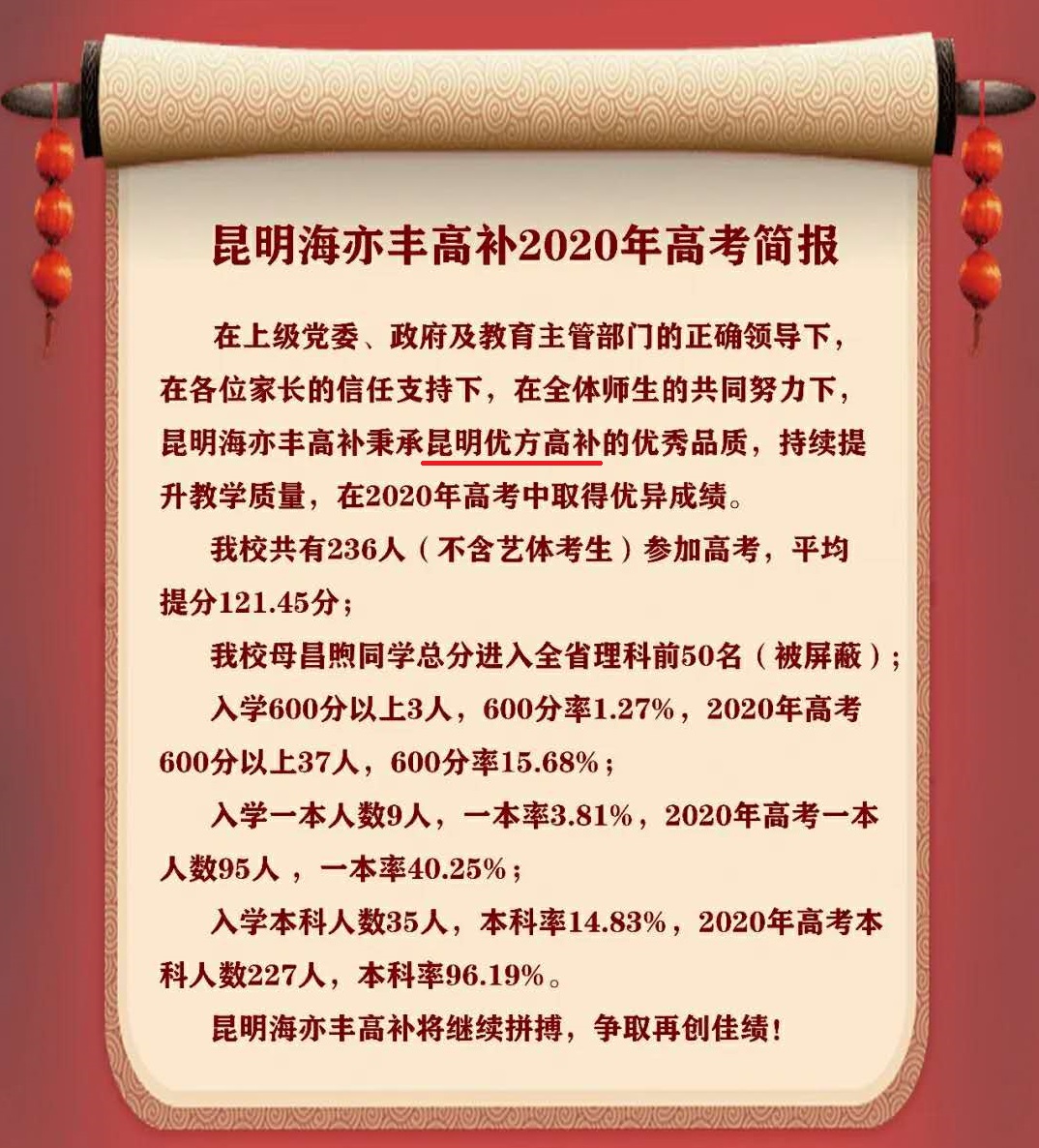 以上是对昆明优方高考补习学校上线率的简单叙述,不知道昆明优方高考补习学校能符合同学们的选择吗?如有任何问题,欢迎大家拨打上方电话给老师咨询哦!