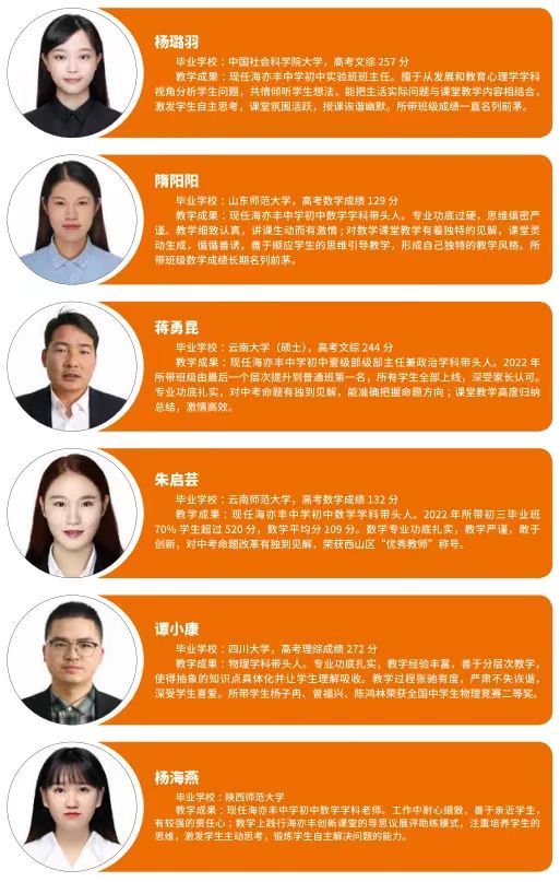 昆明海亦丰中学高聘请、学科带头人及骨干教师,拥有多年丰富的教学及命题经验,达到教师教学水平。目前,高中部共有教师160人,其中,专职授课教师100人,专职班主任60人。具有研究生学历112人,名校本科学历48人。初中部共有教师100人,专职授课教师60人,专职班主任40人。具有研究生学历50人,名校本科学历50人。