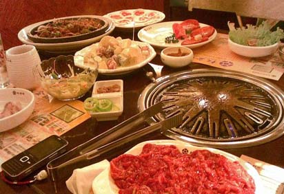 韩国烤肉是韩国料理中的一道大菜。韩国烤肉主要以牛肉为主,如牛里脊、牛排、牛舌、牛腰等。还有海鲜、生鱼片等都是韩国烧烤的美味,但是尤以烤牛里脊和烤牛排最有名,因为其肉质最鲜美爽嫩。韩国烤肉吃法有别于中国烤肉和巴西烤肉,其吃法很特别,吃烤肉的时候要包着生菜叶或苏子叶吃。通常是在手里摊开生菜叶,也可以重叠地铺上苏子叶,夹一块儿烤肉,抹一点儿韩国的辣酱,也可以随意地放上泡菜和米饭,最后收拢菜叶,裹成一团即可食用,生菜叶或苏子叶的清爽、烤肉和着辣酱等作料的浓香,使人们享受美食带来的快感。