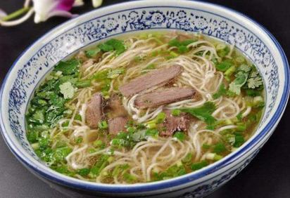 牛肉拉面又称清汤牛肉拉面,是“中国十大面条”之一,是甘肃省兰州地区的风味小吃。它以“汤镜者清,肉烂者香,面细者精”的独特风味和“一清二白三红四绿五黄”,一清(汤清)、二白(萝卜白)、三红(辣椒油红)、四绿(香菜、蒜苗绿)