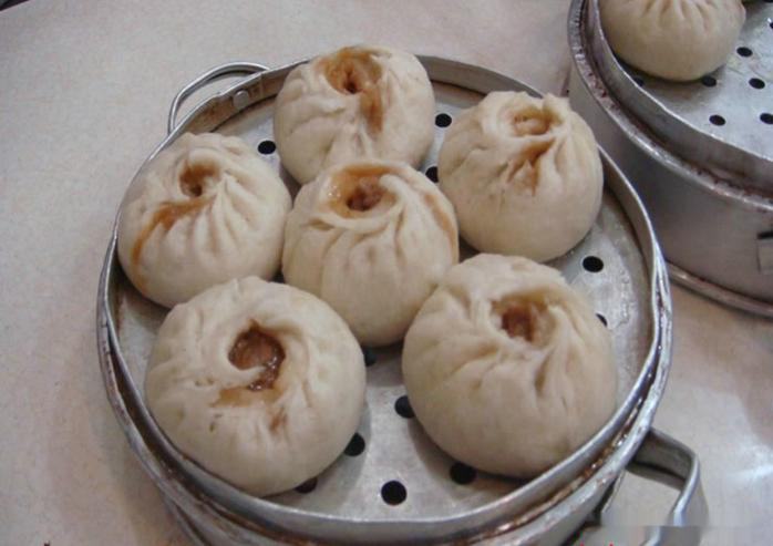 龙眼包子制作:精选特等精面,加入酵母发酵后,加上白糖、猪油,揉制后要达到面光、盆光、手光;馅料优选后猪腿肉,调味后,浇进煨炖的鸡汁、茨菇,搅拌成香气四溢的肉馅。